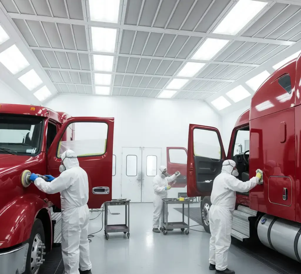 En TRB del Bajío contamos con cabina de pintura certificada CESVI y procesos controlados para la reparación estética y estructural de tractocamiones, remolques y cajas. Atendemos desde golpes y deformaciones hasta trabajos completos de repintado, cuidando la preparación de superficies, el igualado de color y la aplicación de recubrimientos de alta resistencia.